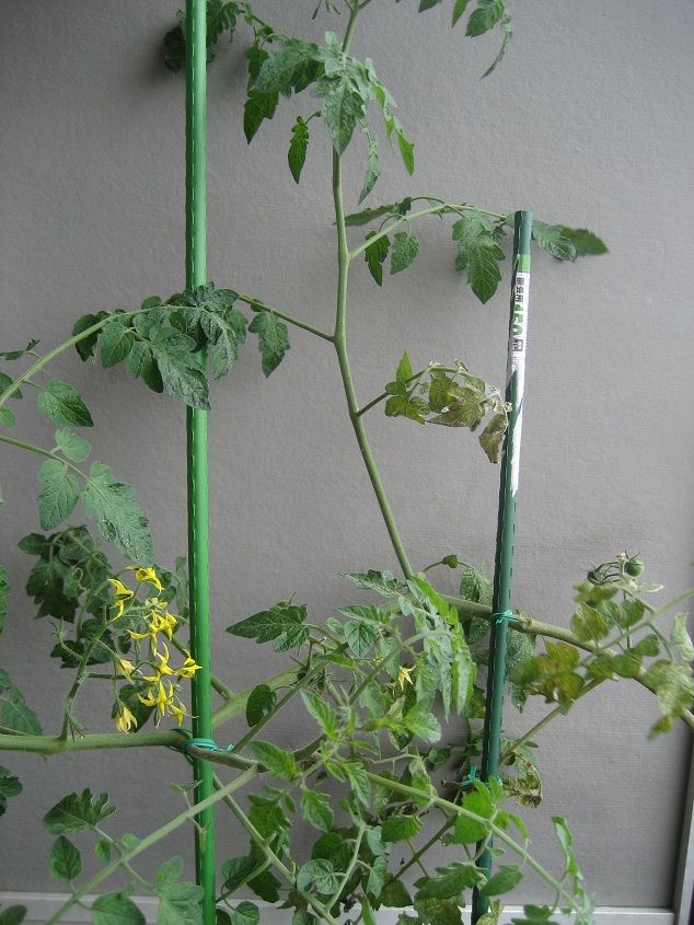 2024-07-01 ミニトマト8週目 菜園 ミニトマトは支柱を追加する。 100均ショップで買った180cmが2本。 別の100均ショップで買った150cmが1本。 しかし、強風で花が落ちてしまい、ガックリ。 ミニトマトに支柱を追加